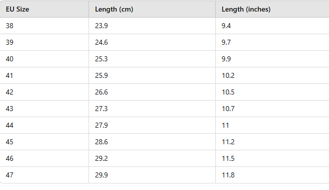 We recommend measuring both of your feet from your heel to your longest toe. Take the longest measurement, add 5mm (0.2 inches) and then compare this measurement to our size chart. Alternatively, customers are advised to opt for their nearest EU size, rounding up if they measure an exact half-size. You can also compare sizes with other brands here.