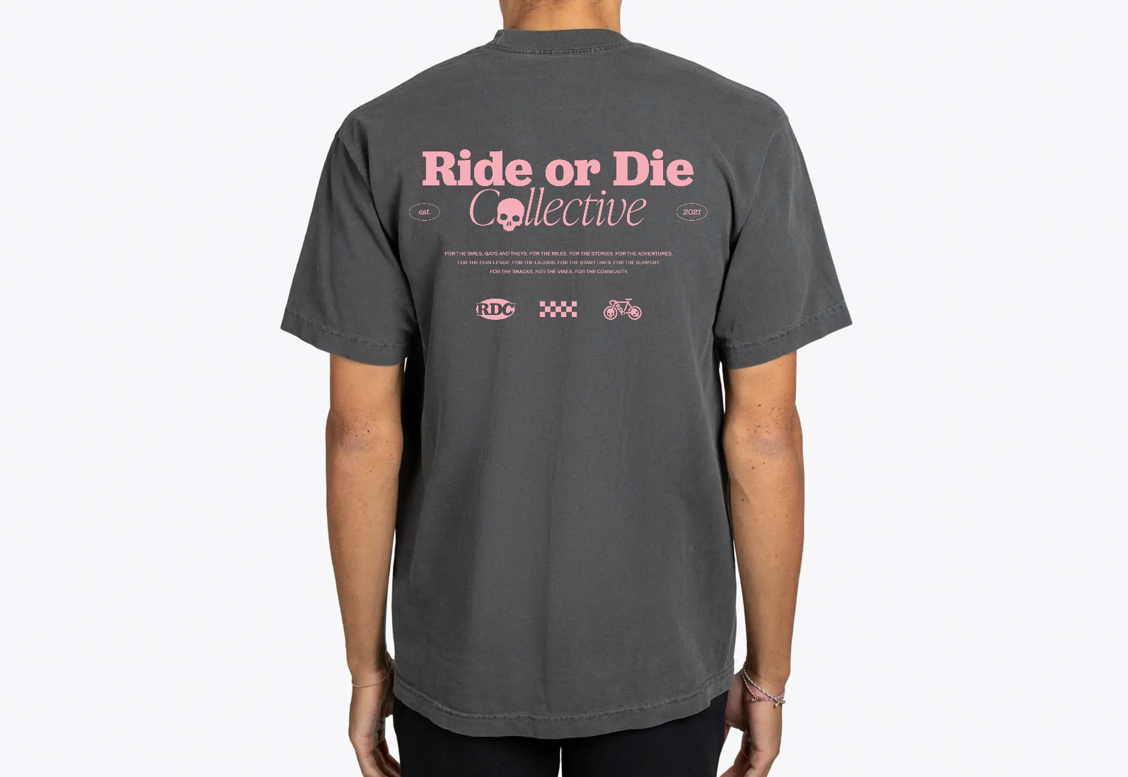 Back of Shirt - "Ride or Die Collective - For the Girls, Gays, and Theys. For the Miles. For the Stories. For the Adventures. For the Challenge. For the Laughs. For the Start Lines. For the Support. For the Snacks. For the Vibes. For the Community."