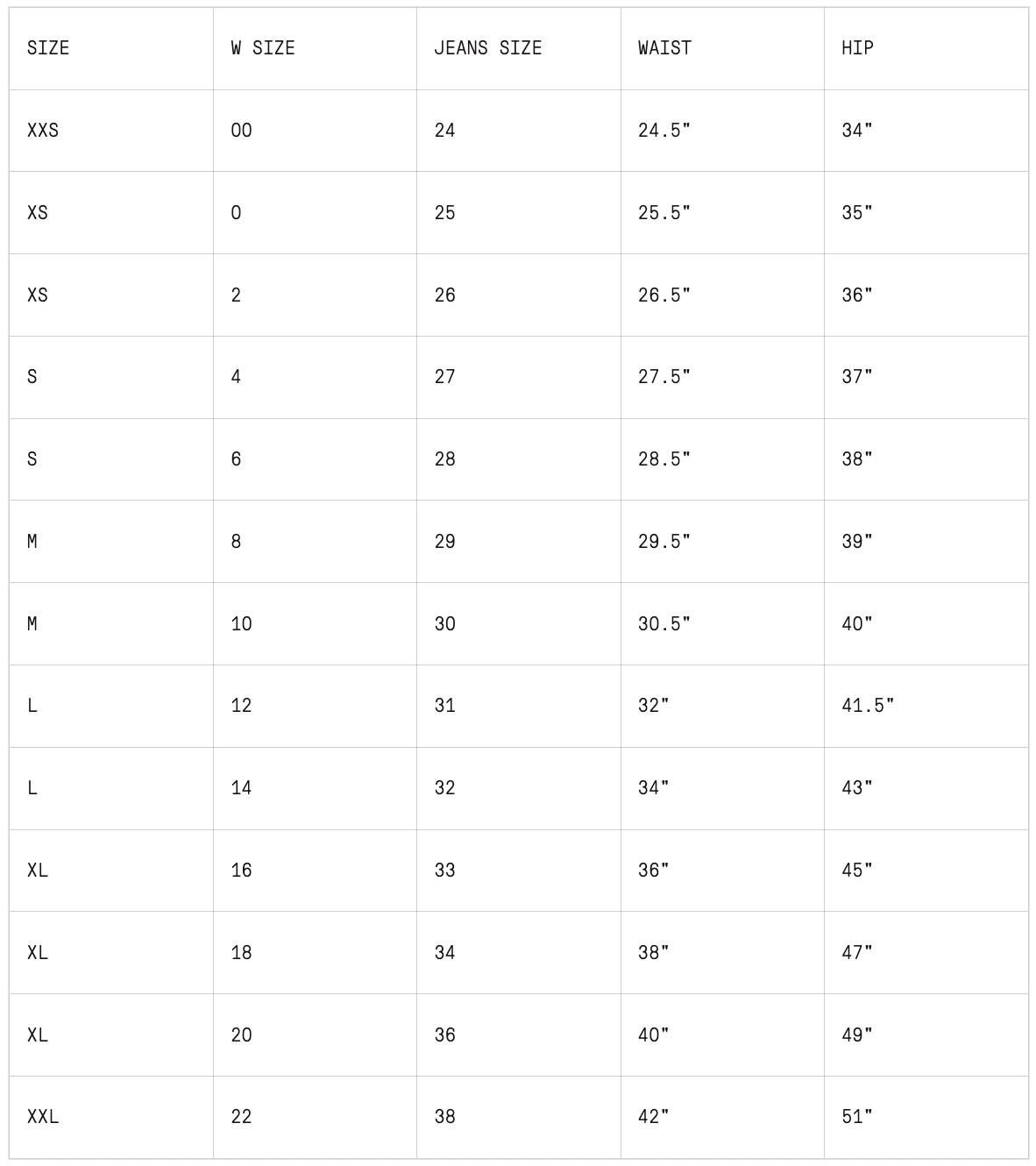 Women's Ripton Jeans and Jorts Size Guide